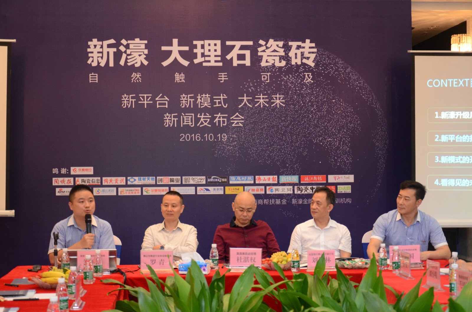 10月19日上午,新濠大理石瓷磚“新平臺 新模式 大未來”新聞發(fā)布會在佛山新濠展廳召開。華夏銀行佛山分行副行長劉振林、金融部總經(jīng)理謝文斌,佛山陶瓷行業(yè)協(xié)會秘書長羅青,昊晟集團總經(jīng)理杜湛權(quán)、財務總經(jīng)理羅燕清,新濠大理石瓷磚品牌營銷總經(jīng)理朱國亮、副總經(jīng)理柯寓國,產(chǎn)品事業(yè)部策劃總監(jiān)孫慶,以及來自行業(yè)的近30家主流媒體記者等出席發(fā)布會。